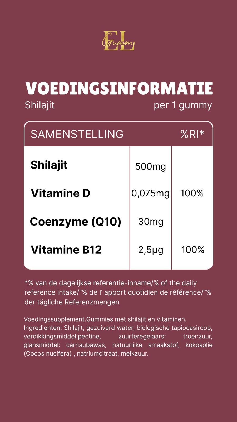 Unsere EL Gummo Shilajit Gummies kombinieren 500 mg reines Shilajit mit Coenzym Q10, Vitamin D und Vitamin B12 – in einem leicht zu schluckenden, leckeren Gummibärchen.